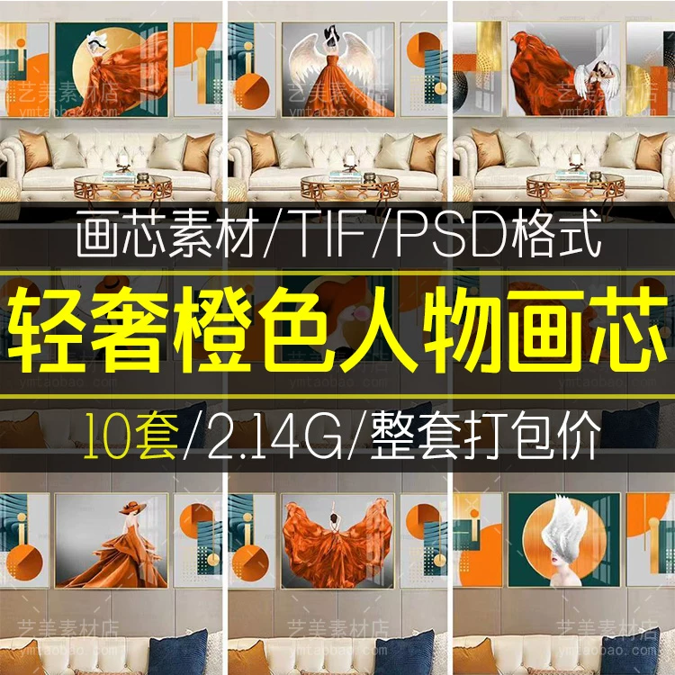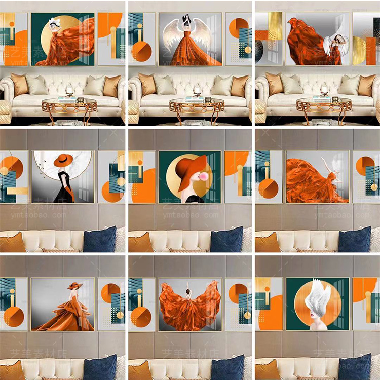 轻奢爱马仕橙色抽象几何美女人物光影效果客厅三联装饰画图素材