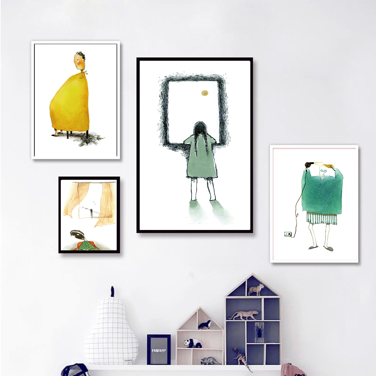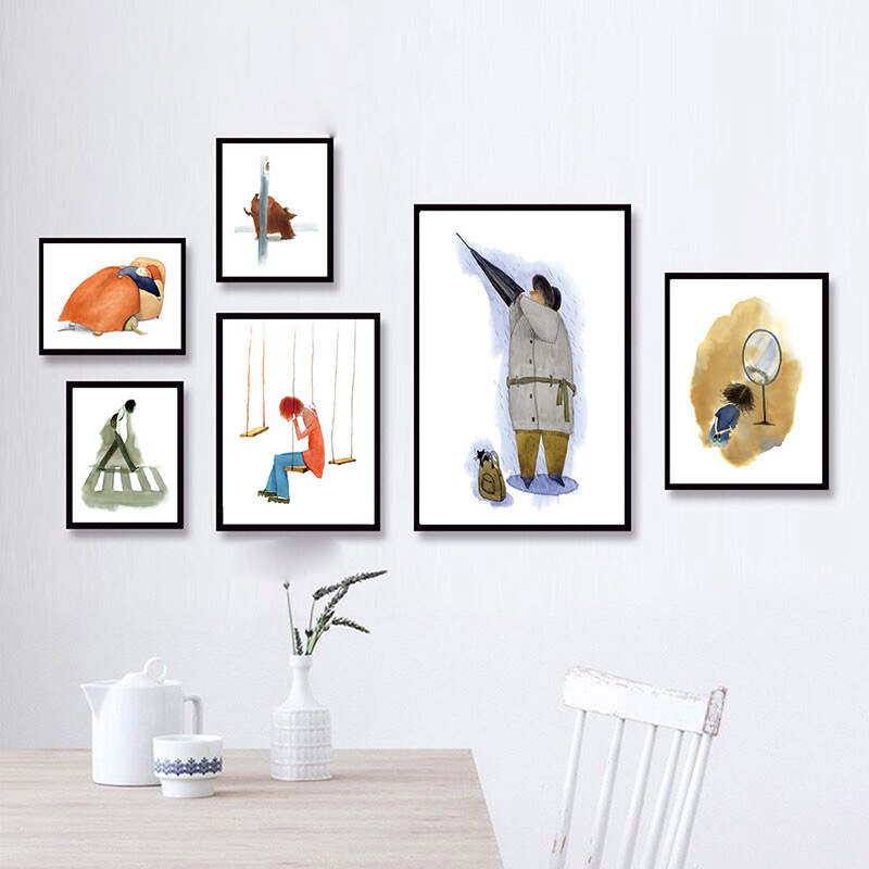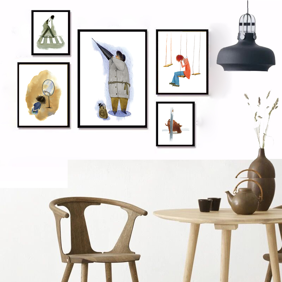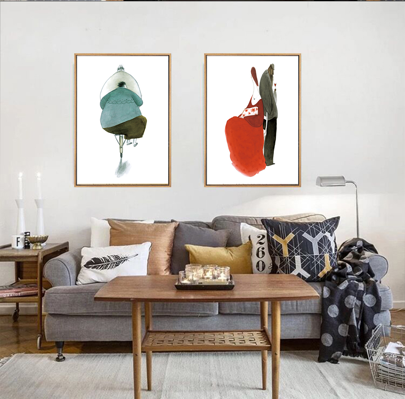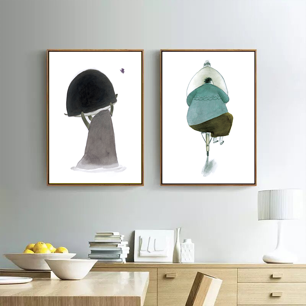 北欧可爱风手绘人物动物插画餐客厅儿童房装饰画素材高清图库