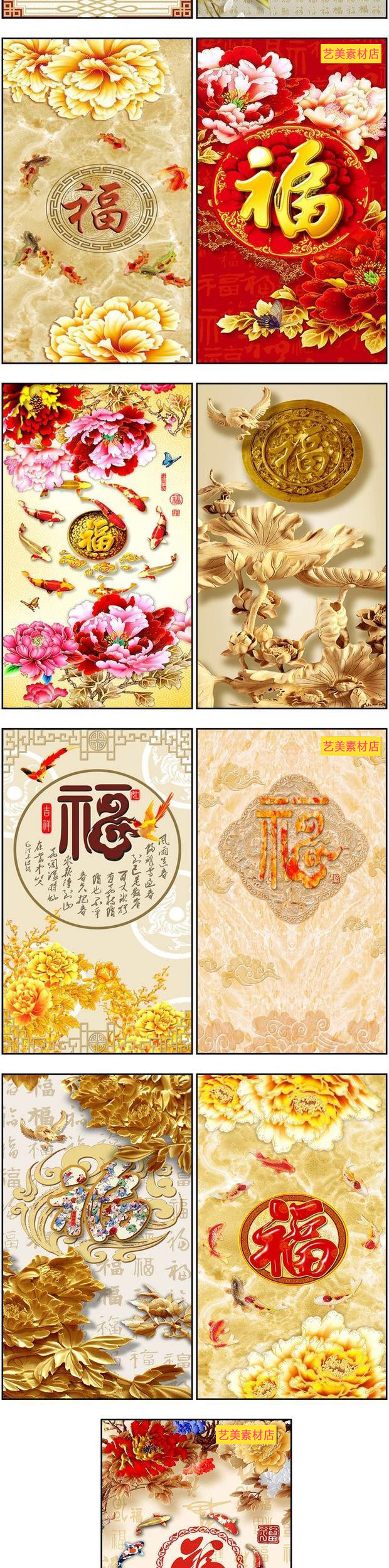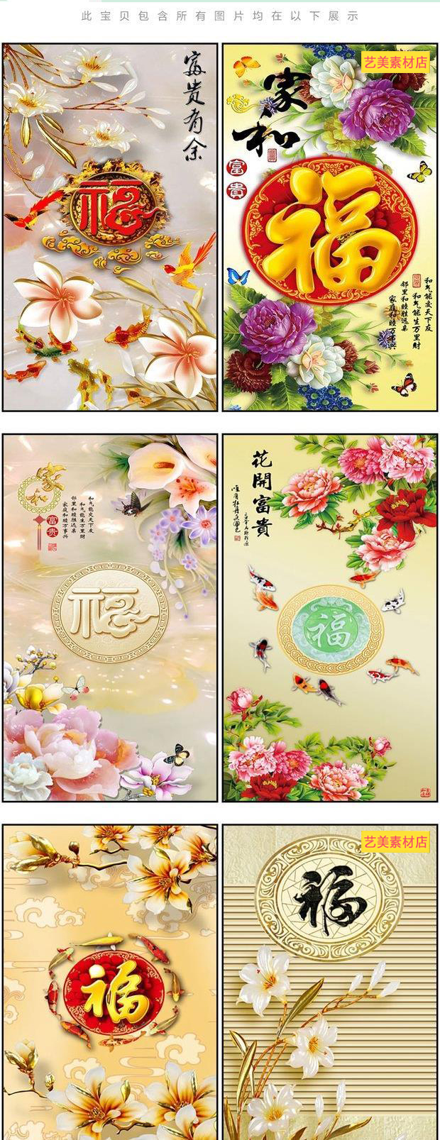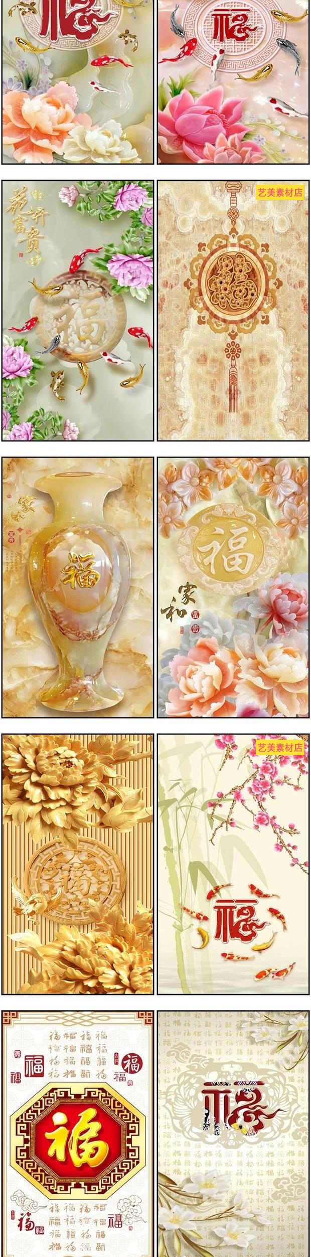 立体轻奢晶瓷玉雕珠宝福字中式玄关花卉装饰画图片图库设计素材